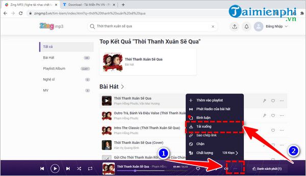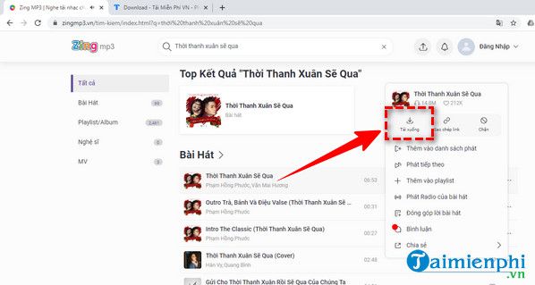 Giao diện của bài 'Thời thanh xuân sẽ qua' sẽ hiện ra, nhấn 'Tải xuống' như hình dưới.