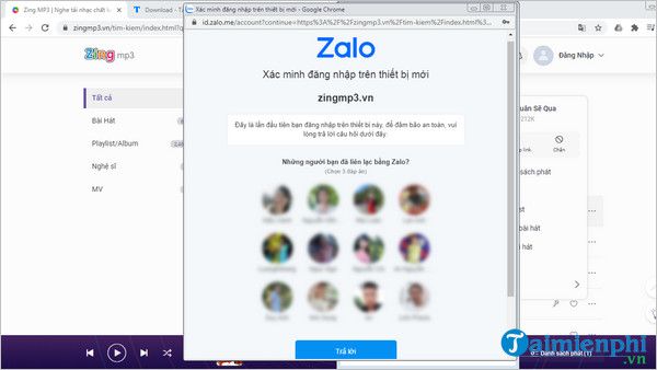 Đăng nhập Zalo để tải nhạc MP3 trên Zing MP3, nhập số điện thoại, mật khẩu. Chọn 3 người bạn liên lạc qua Zalo để xác nhận đăng nhập, click 'Trả lời'. Nếu chọn đúng 3 người, bạn đăng nhập Zalo thành công.