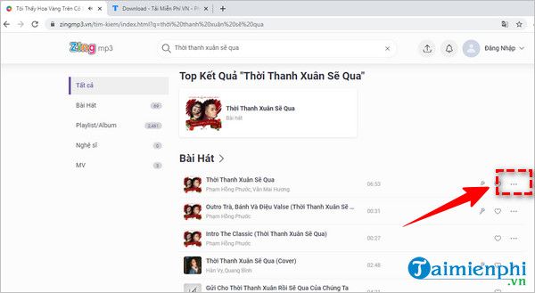 Bước 4: Bạn sẽ thấy nhiều kết quả xuất hiện, chọn một kết quả phù hợp. Ví dụ, bạn chọn bài 'Thời thanh xuân sẽ qua' của Phạm Hồng Phước và Văn Mai Hương bằng cách nhấn vào dấu '...'.