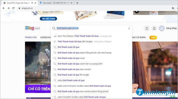 Bước 3: Trên giao diện tìm kiếm Zing MP3, nhập tên bài hát bạn muốn tải về máy. Ví dụ, Mytour muốn tải 'Thời thanh xuân sẽ qua'. Nhấn Enter để xác nhận.