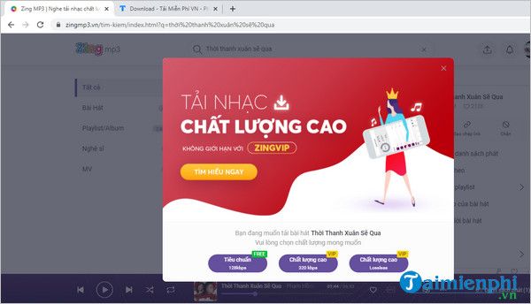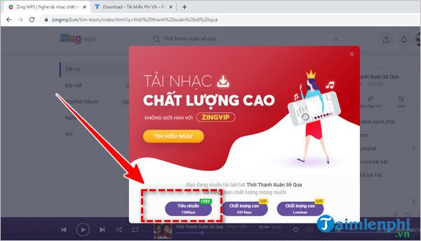 Bước 6: Thực hiện như bước 4. Giao diện Zing MP3 hiển thị chất lượng tải: